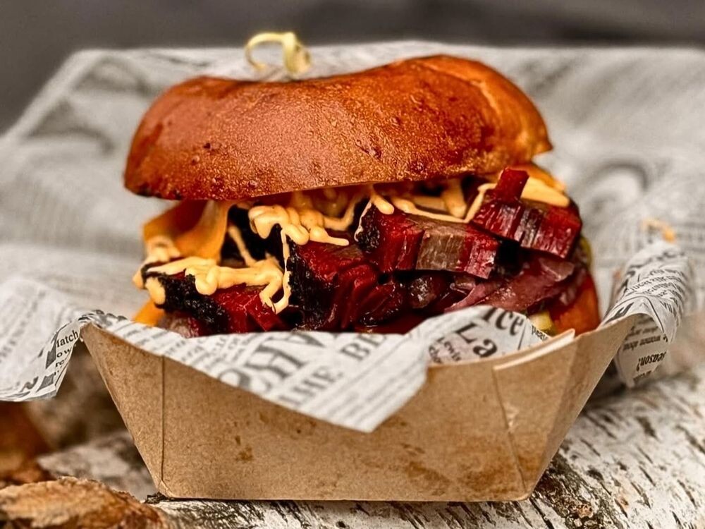 Булочка, брискет говяжий, корнишоны маринованные, маринованный лук, сыр чеддер, укропно-чесночный гель, соус гриль, соус домашний барбекю