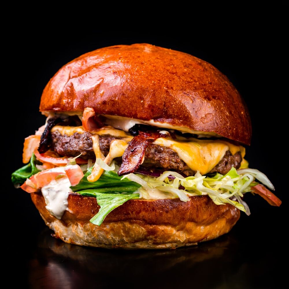 Булочка, говяжья котлета, сыр Чеддер, Соус Цезарь, Красный лук, свежий томат, бекон, айсберг, Чернослив