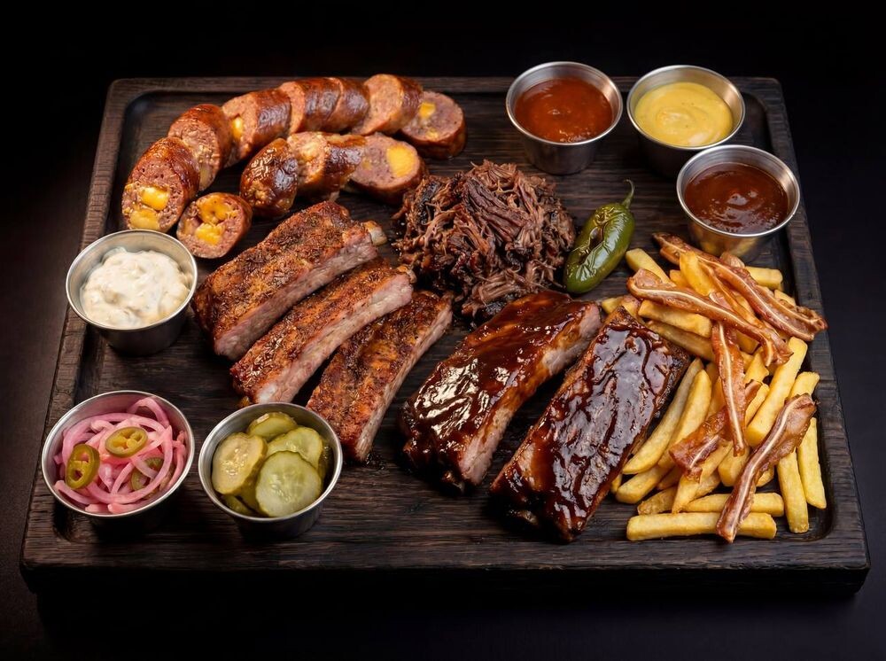 Брискет, Рваная говядина, Язык говяжий, Ребро поросенка, Пивные ребра, Колбаски с сыром чеддер, Копченые ушки, Куриные крылья, Коул Слоу, маринады, Картофель фри, фирменные соусы