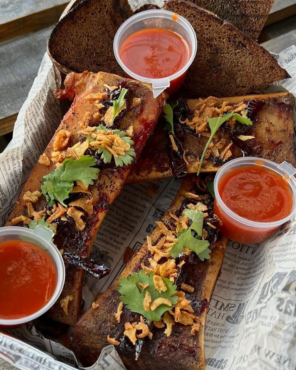 Копченый костный мозг с луковым мармеладом и Сангритой