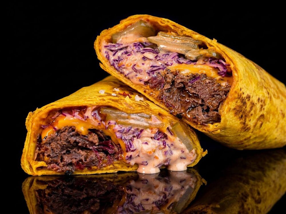 Лаваш, свинина, коул слоу, халапеньо, сыр чеддер, корнишоны маринованные, укропно-чесночный гель, соус домашний BBQ